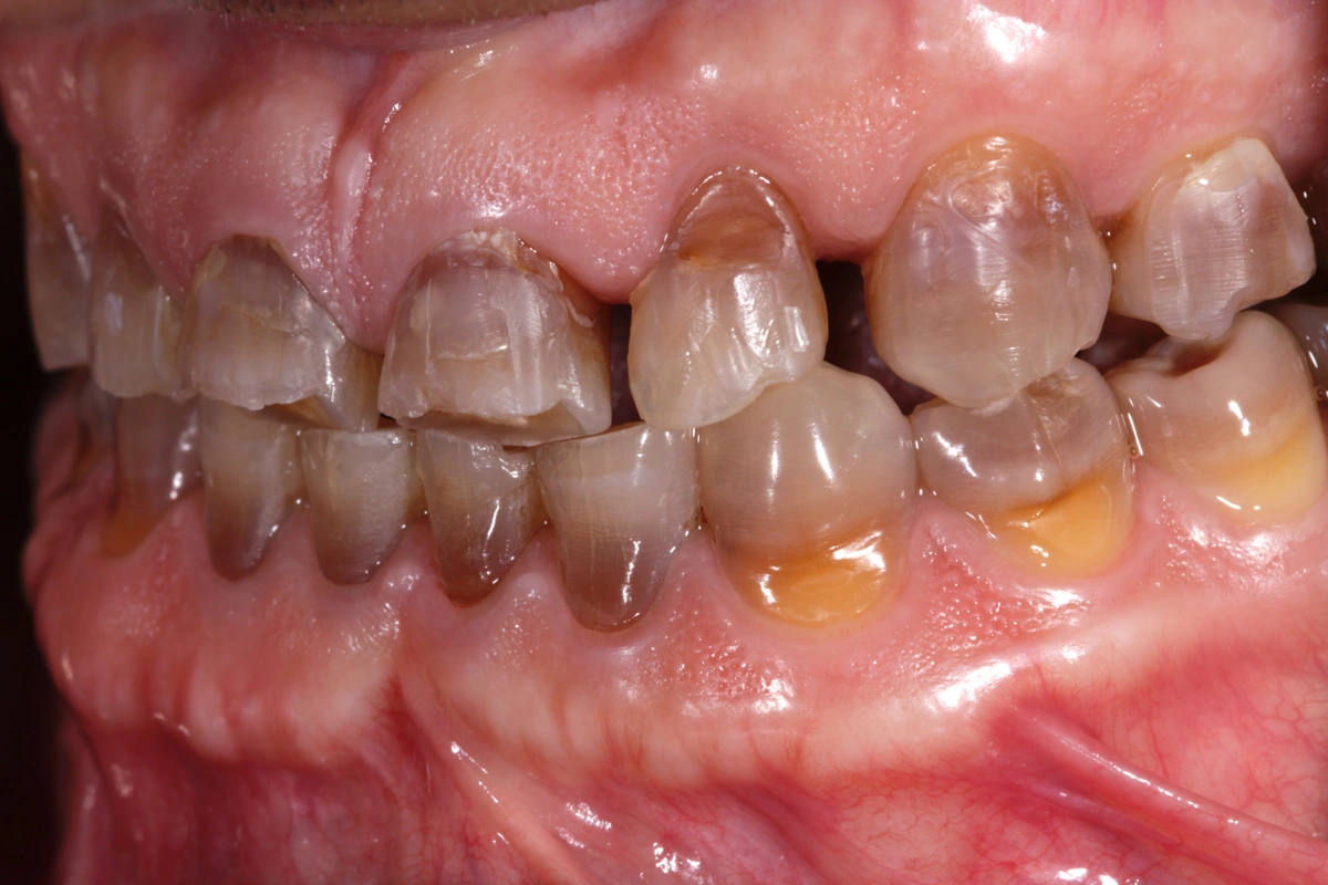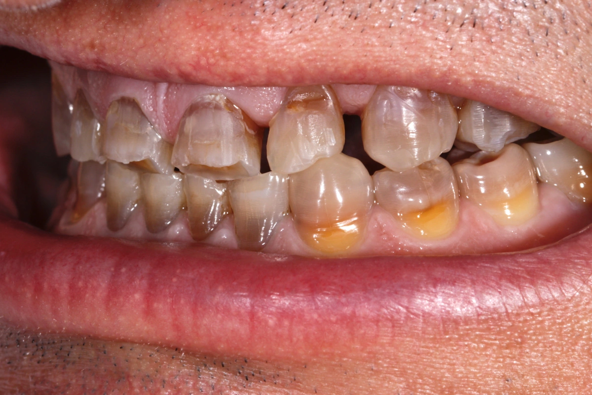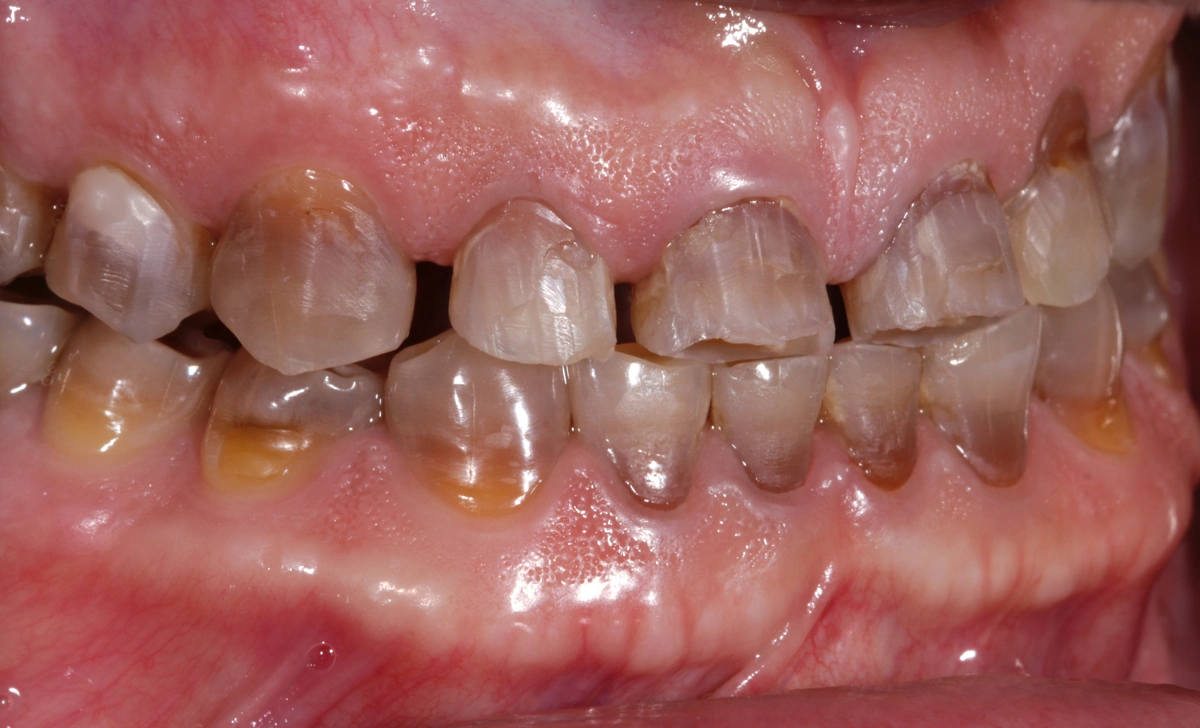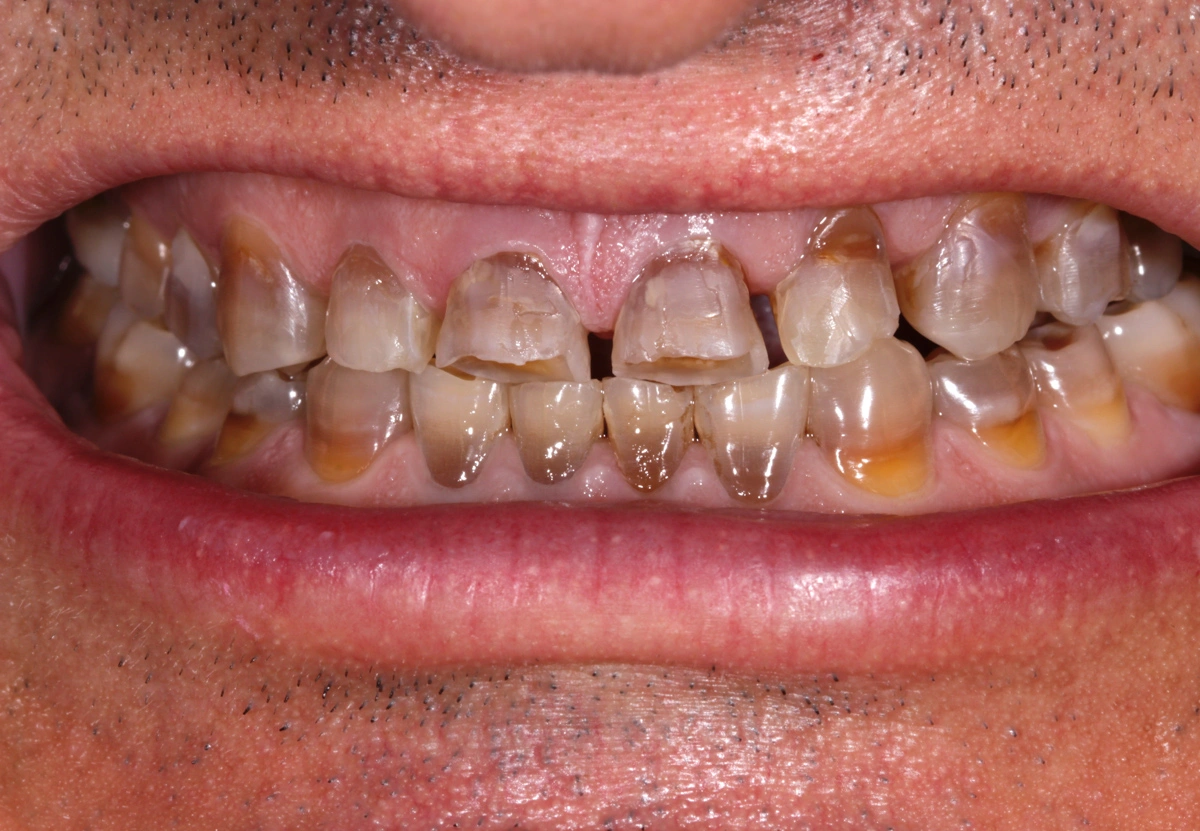 En este caso se trata de un paciente con desgaste dental severo y tinción por tetraciclinas grado IV.